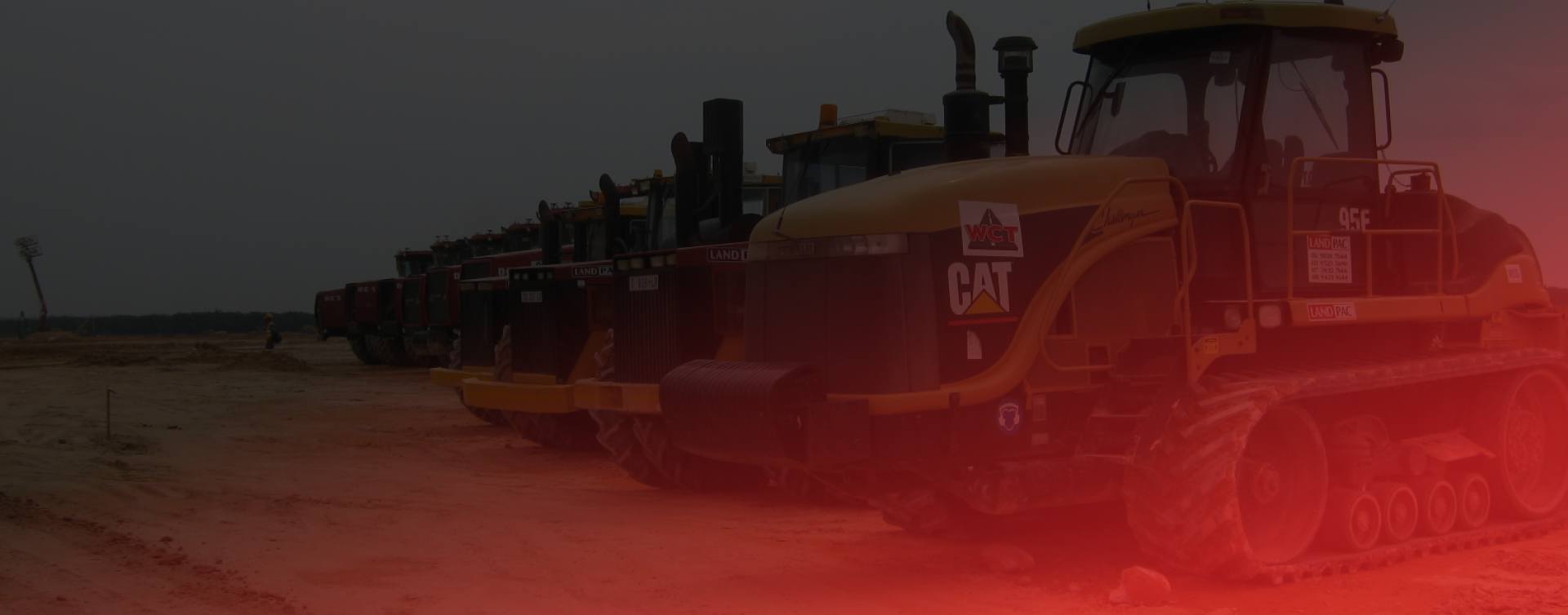 A row of construction vehicles, including Caterpillar machinery, parked in a line on a dirt surface. The image has a dark tint with a red gradient overlay on the right side.