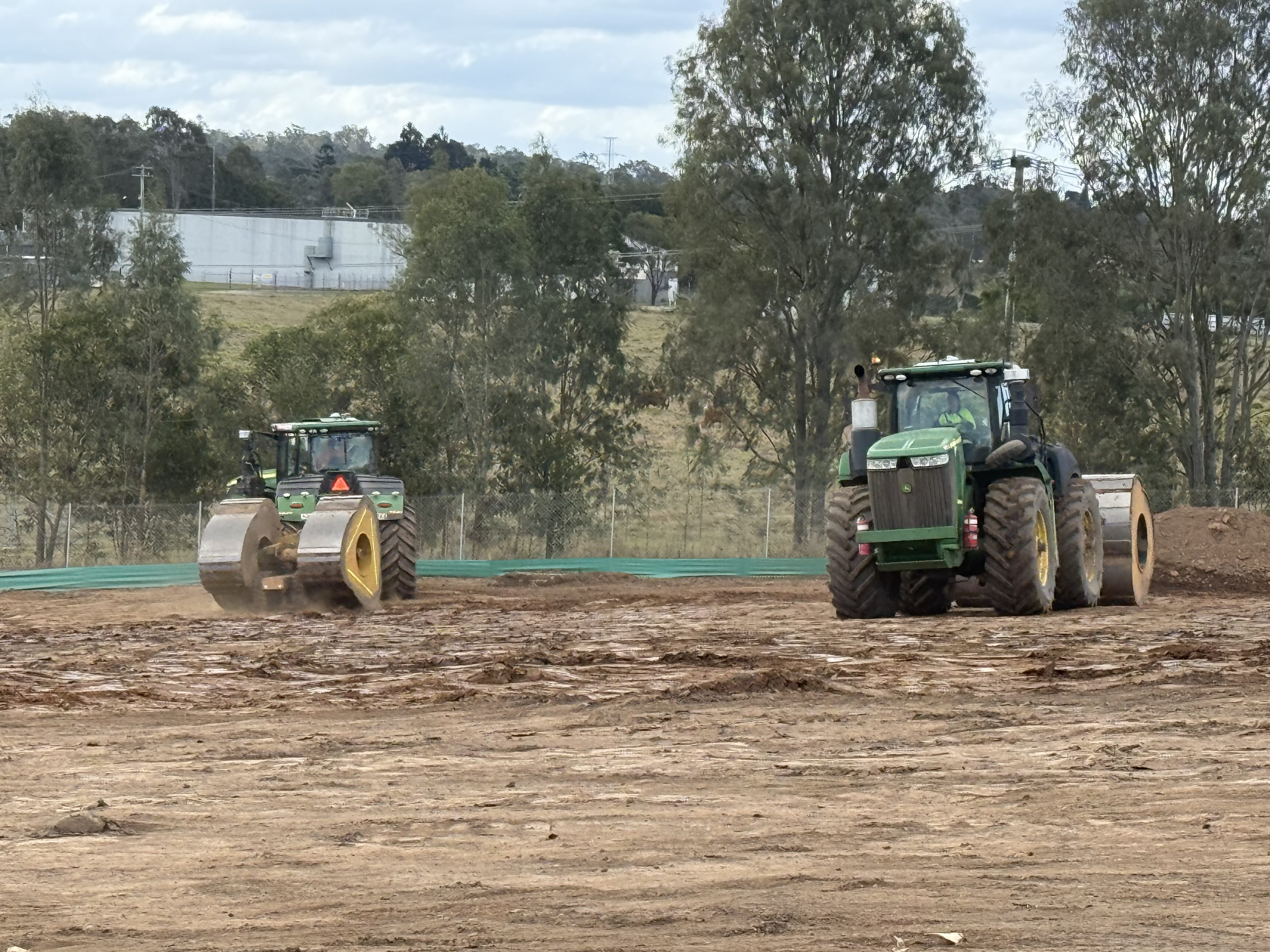 Two tractors with rollers compact uncontrolled fill on a construction site surrounded by trees.